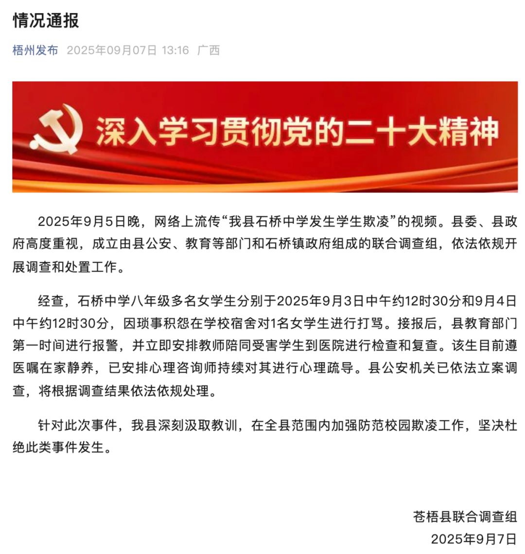 9月7日下午老钱庄,广西梧州市苍梧县联合调查组发布“网传广西一女生被多人霸凌”事件的情况说明: